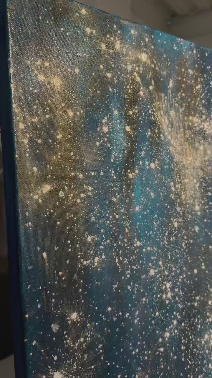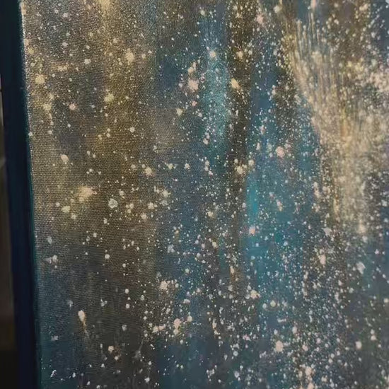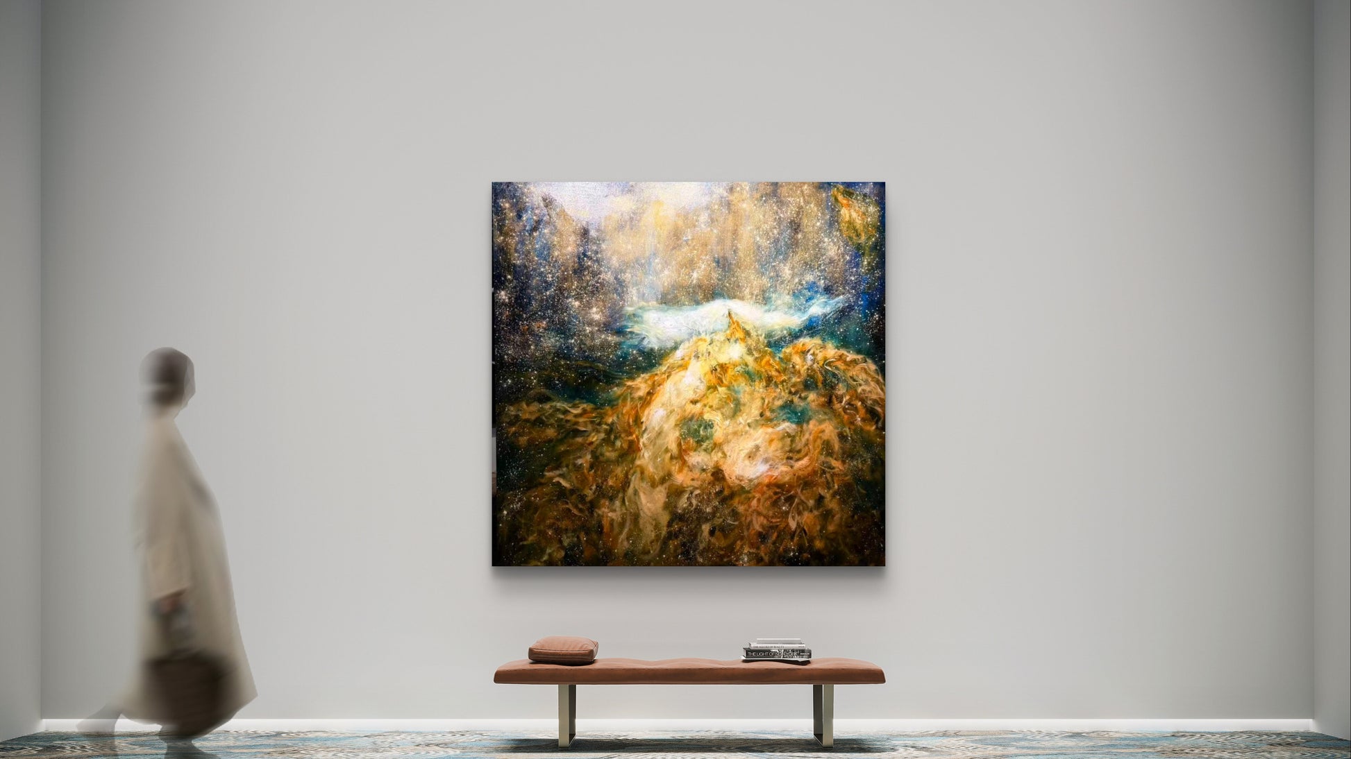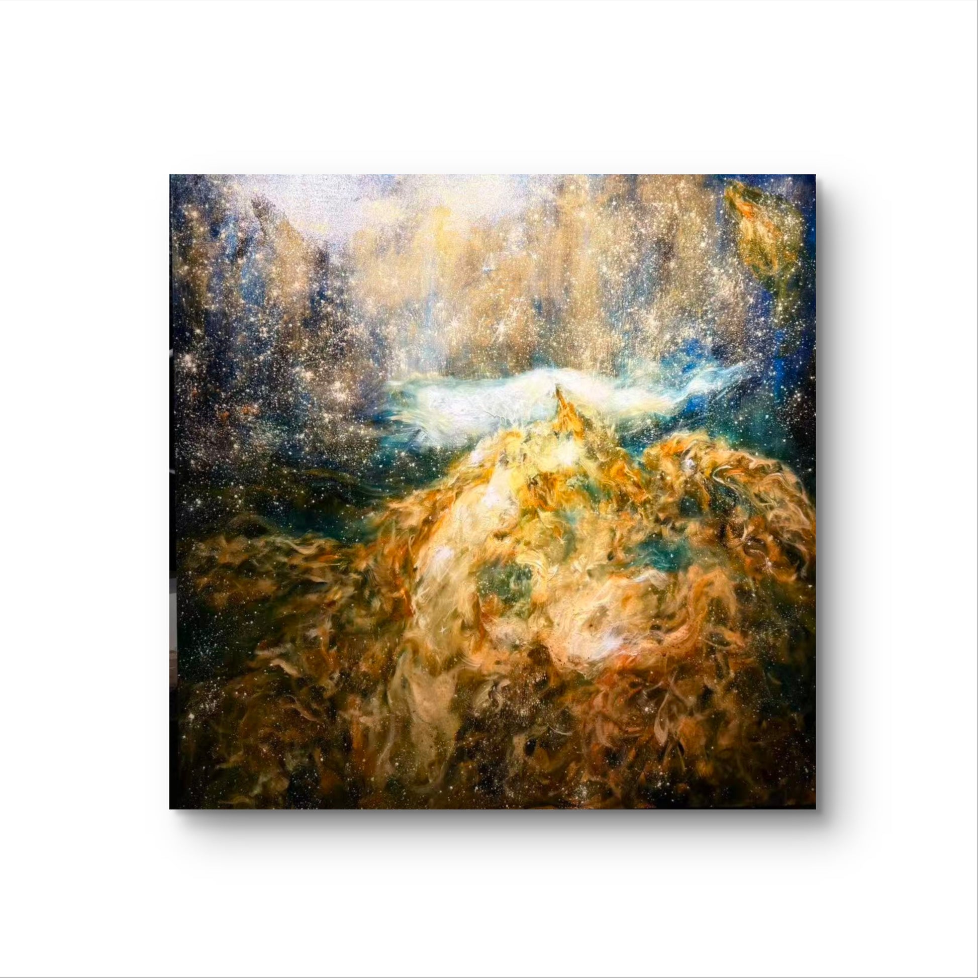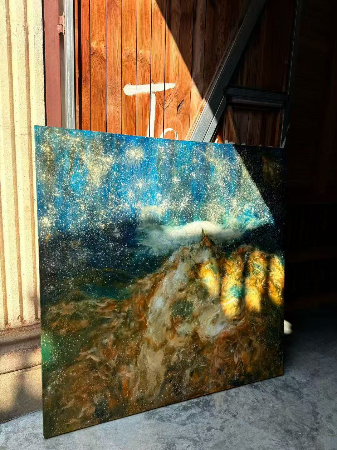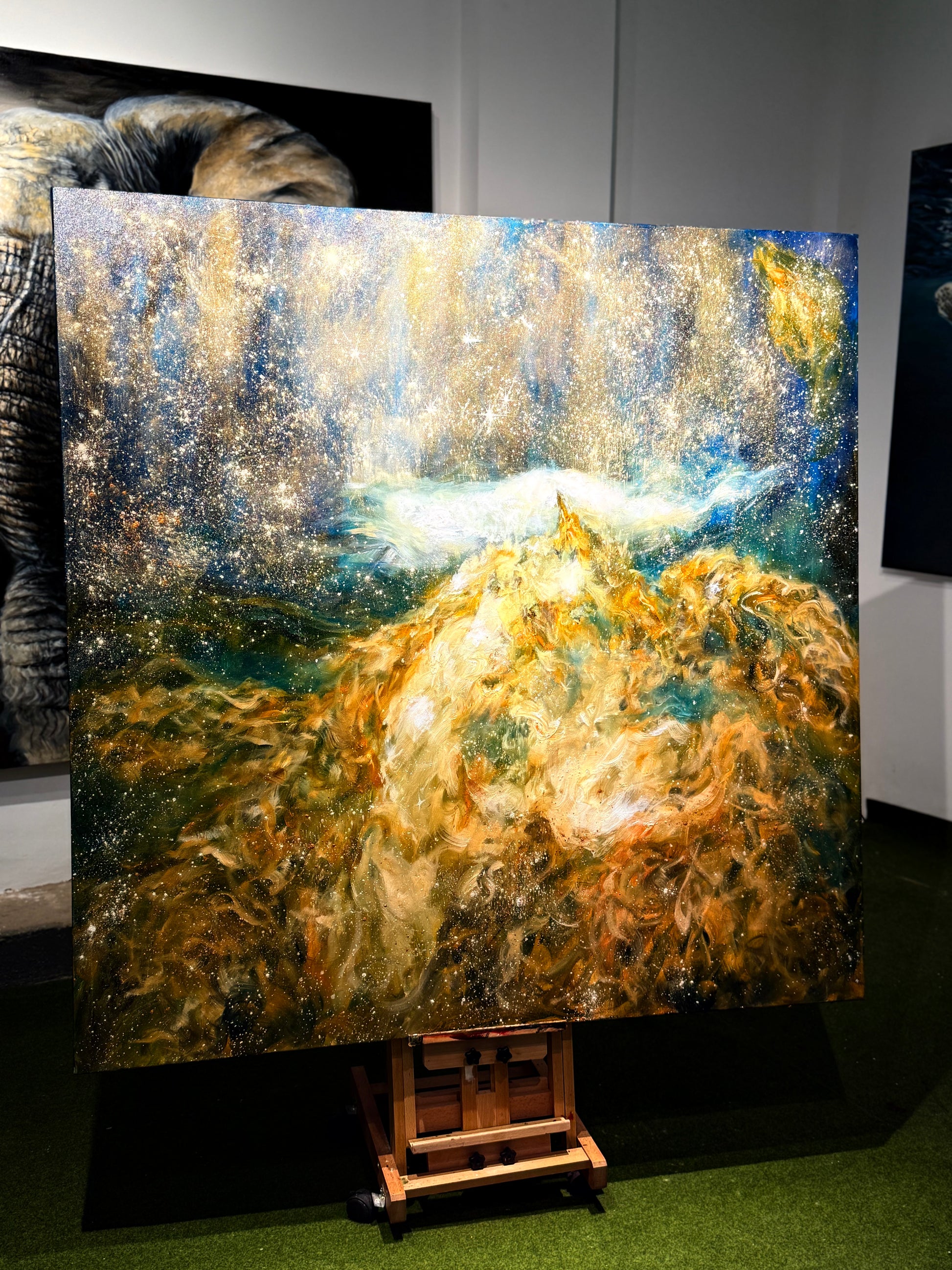 The original oil paining for the universe created by artist henry yuan based in Dubai and China ; 160x160cm, canvas oil painting ;gold\blue\green oil painting in the artist mind for the universe seek