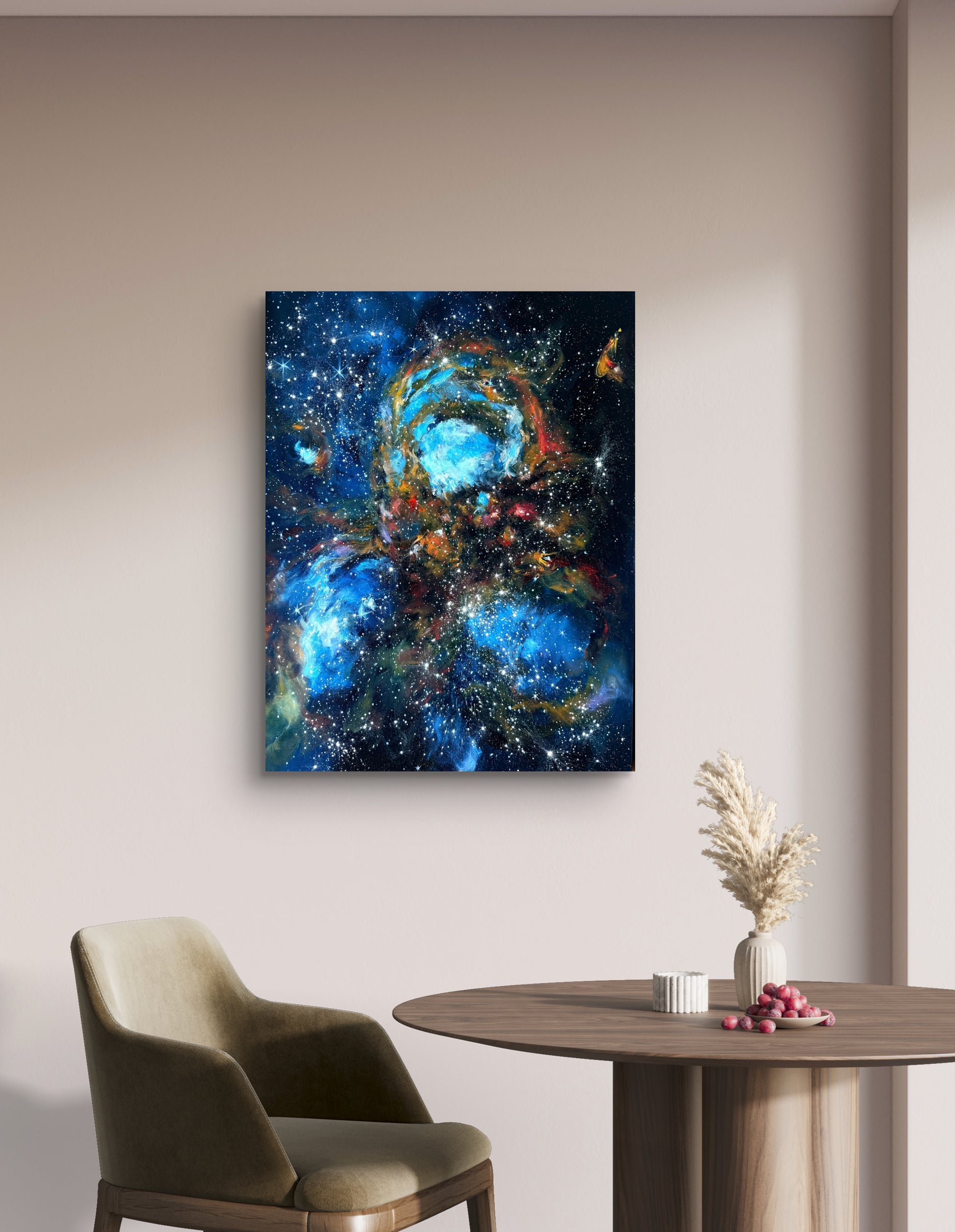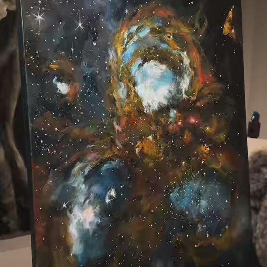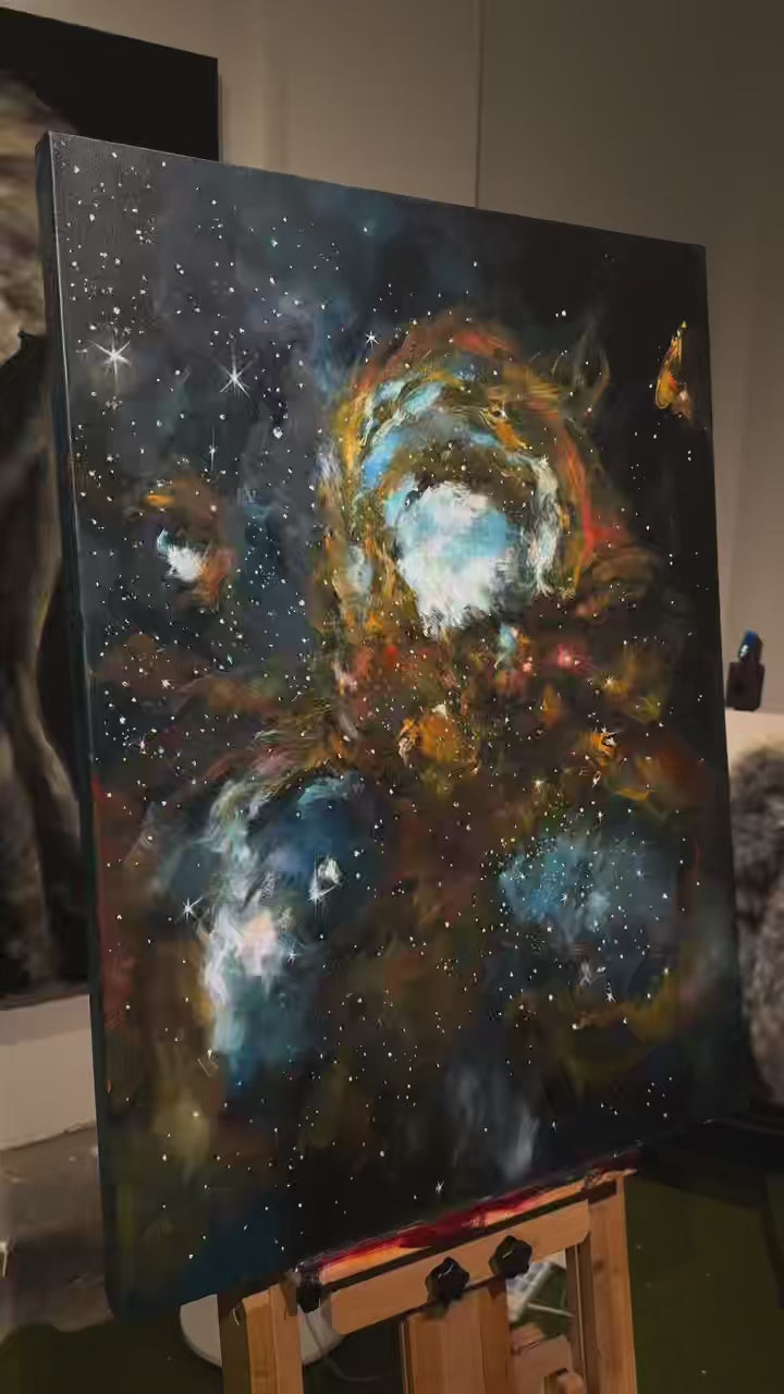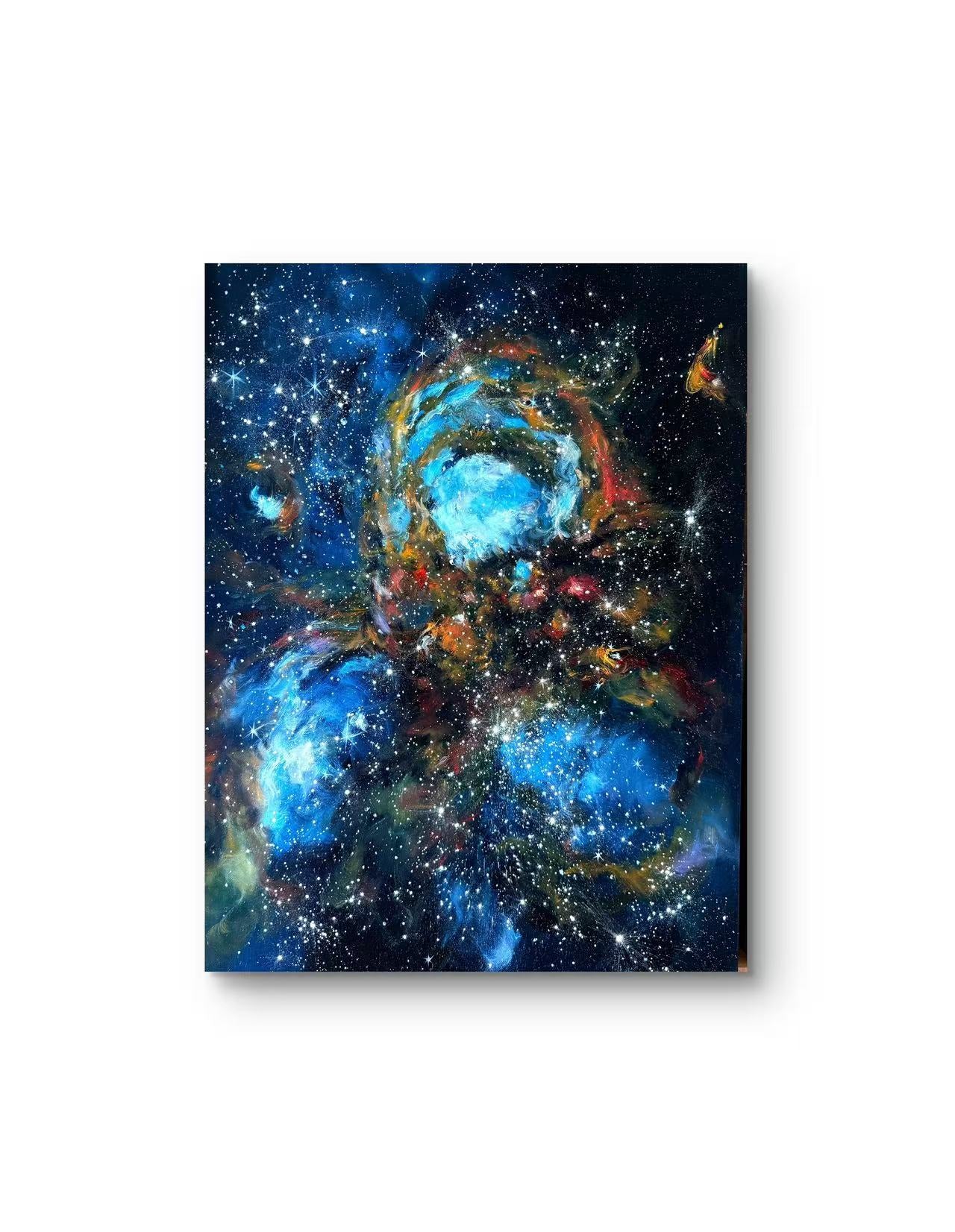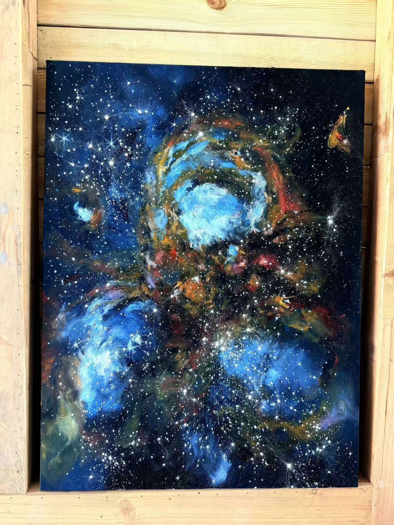 The oil painting of the Cat's Paw Nebula, created by artist Henryyuan, vividly captures the deep hues of the nebula using his own oil paints and linen canvas.