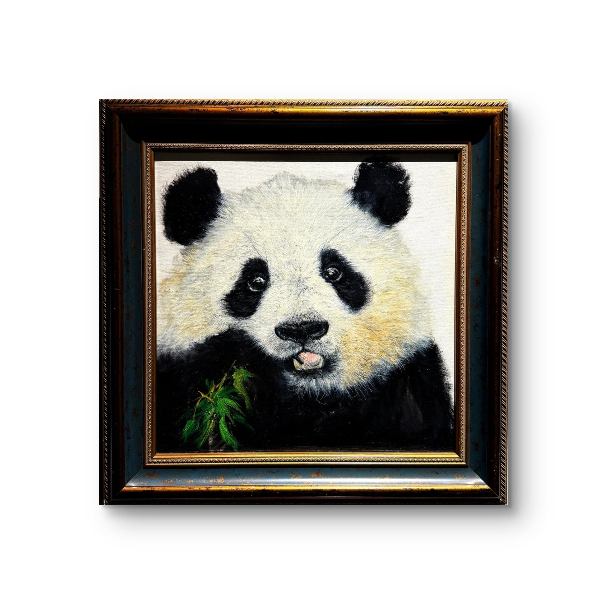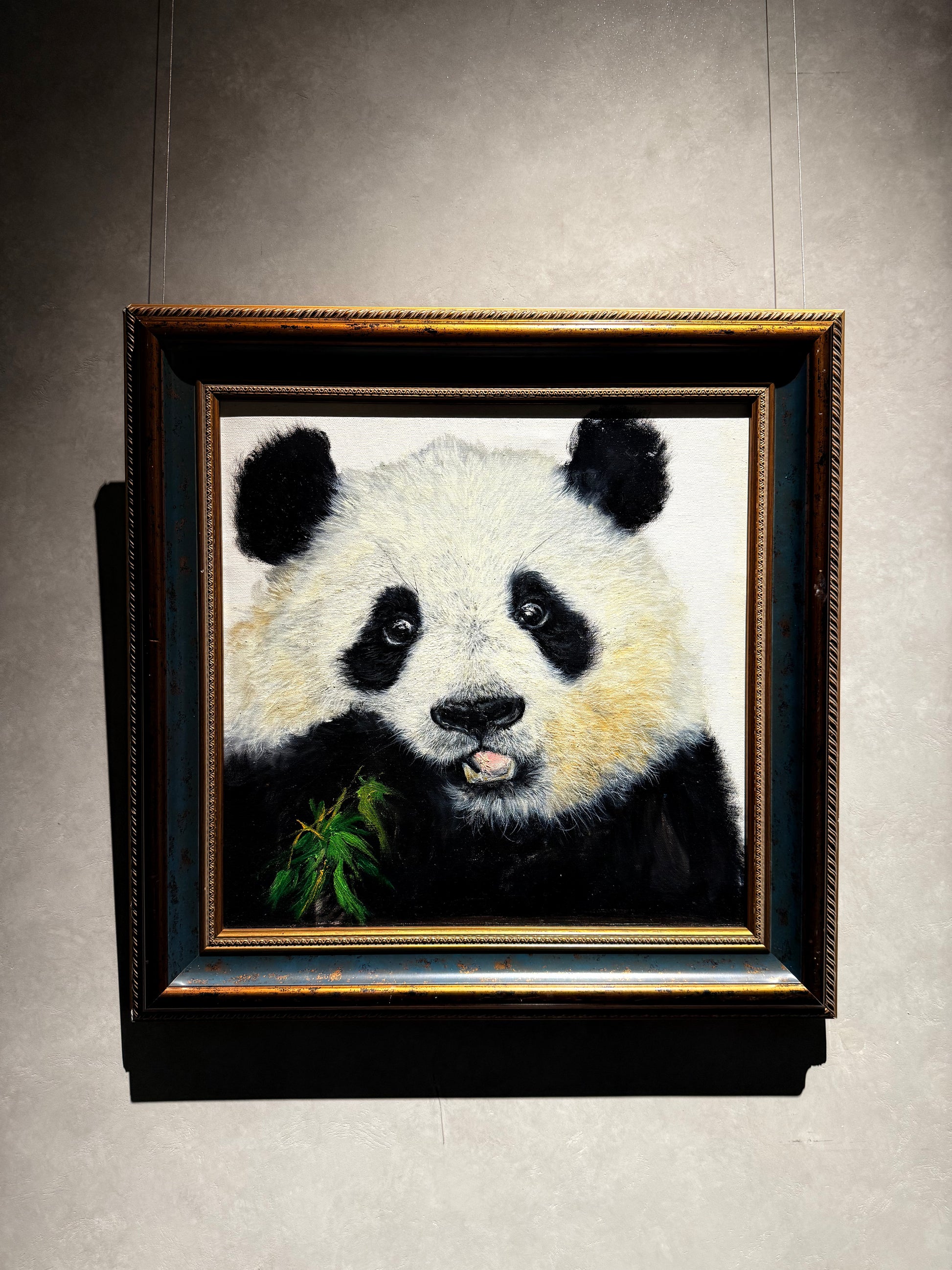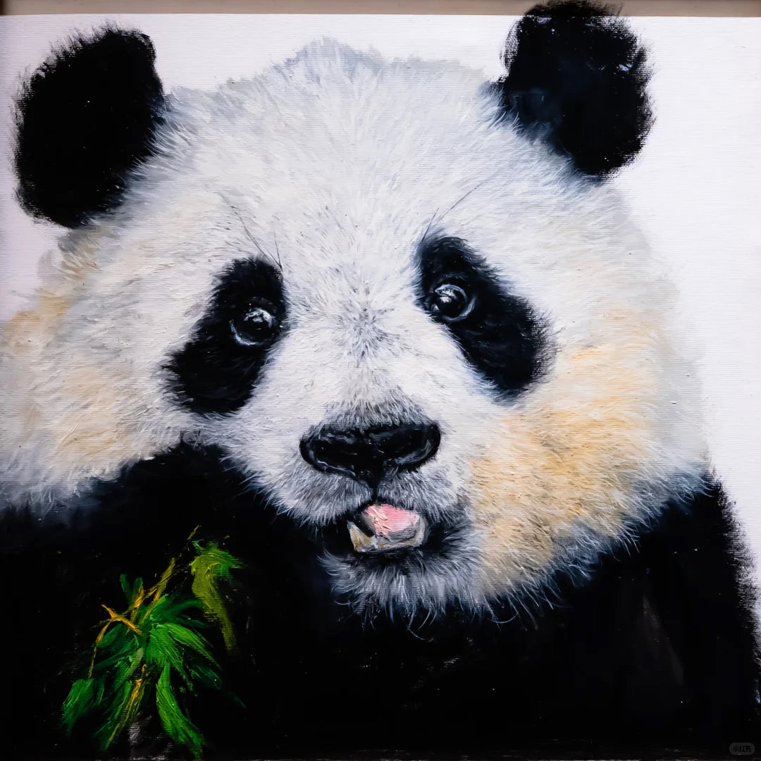 a very cute panda hyper realistic oil painting created by artist Henry yuan for the famous panda fubao