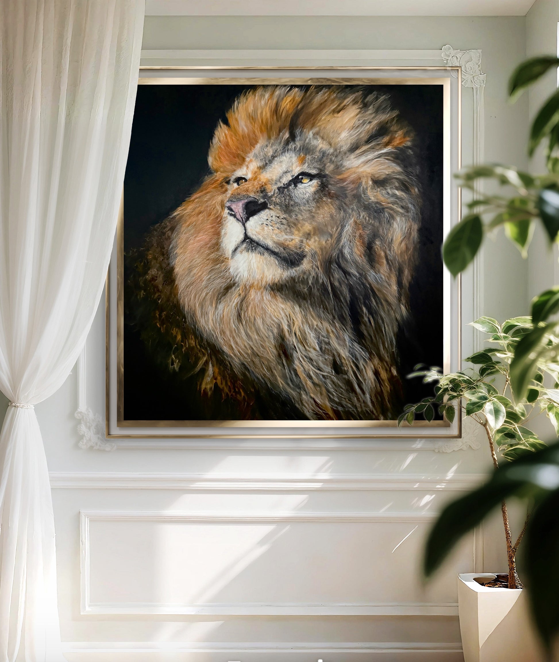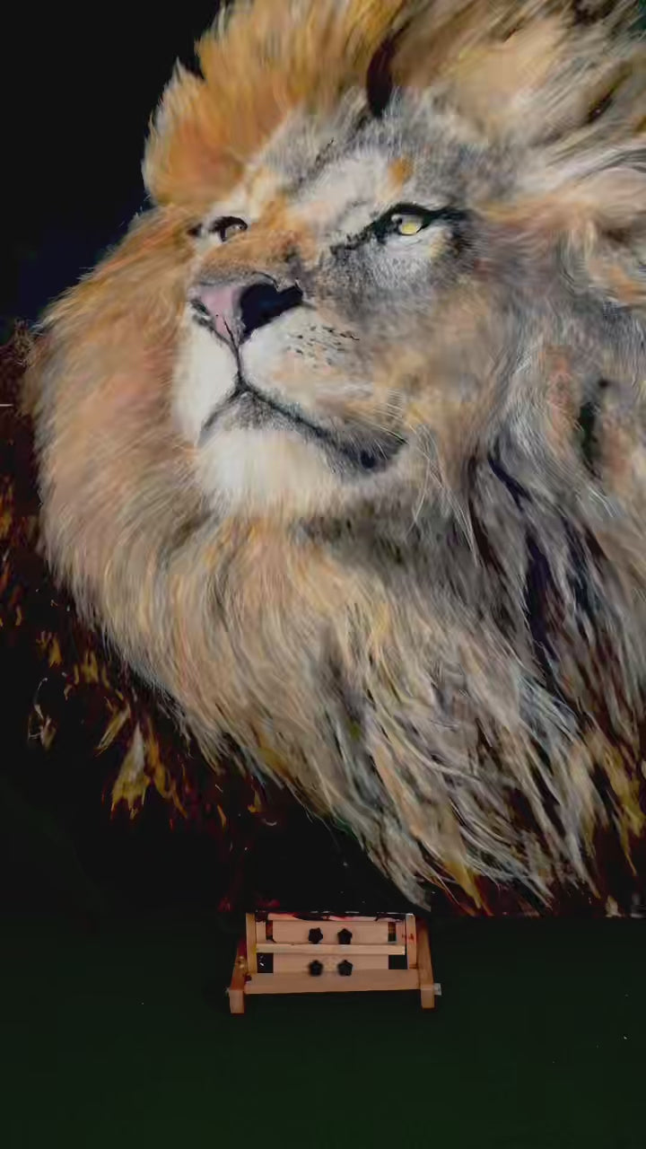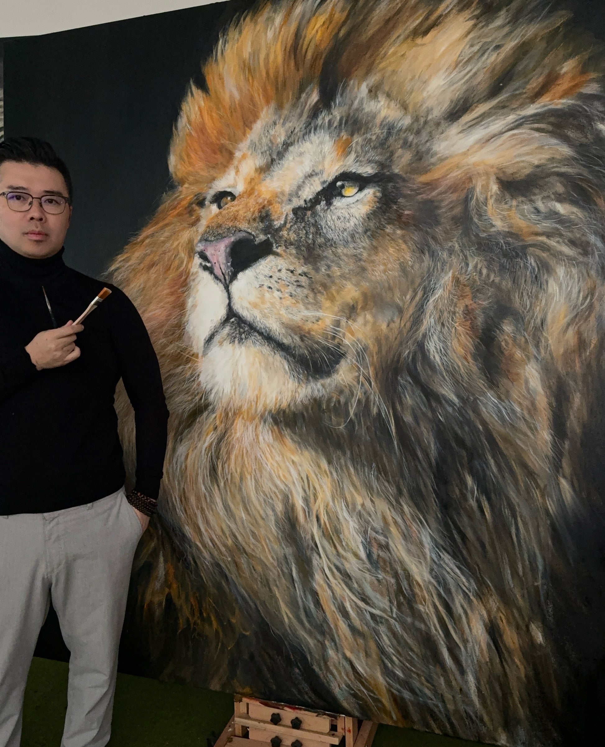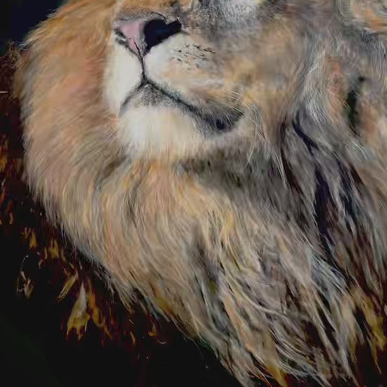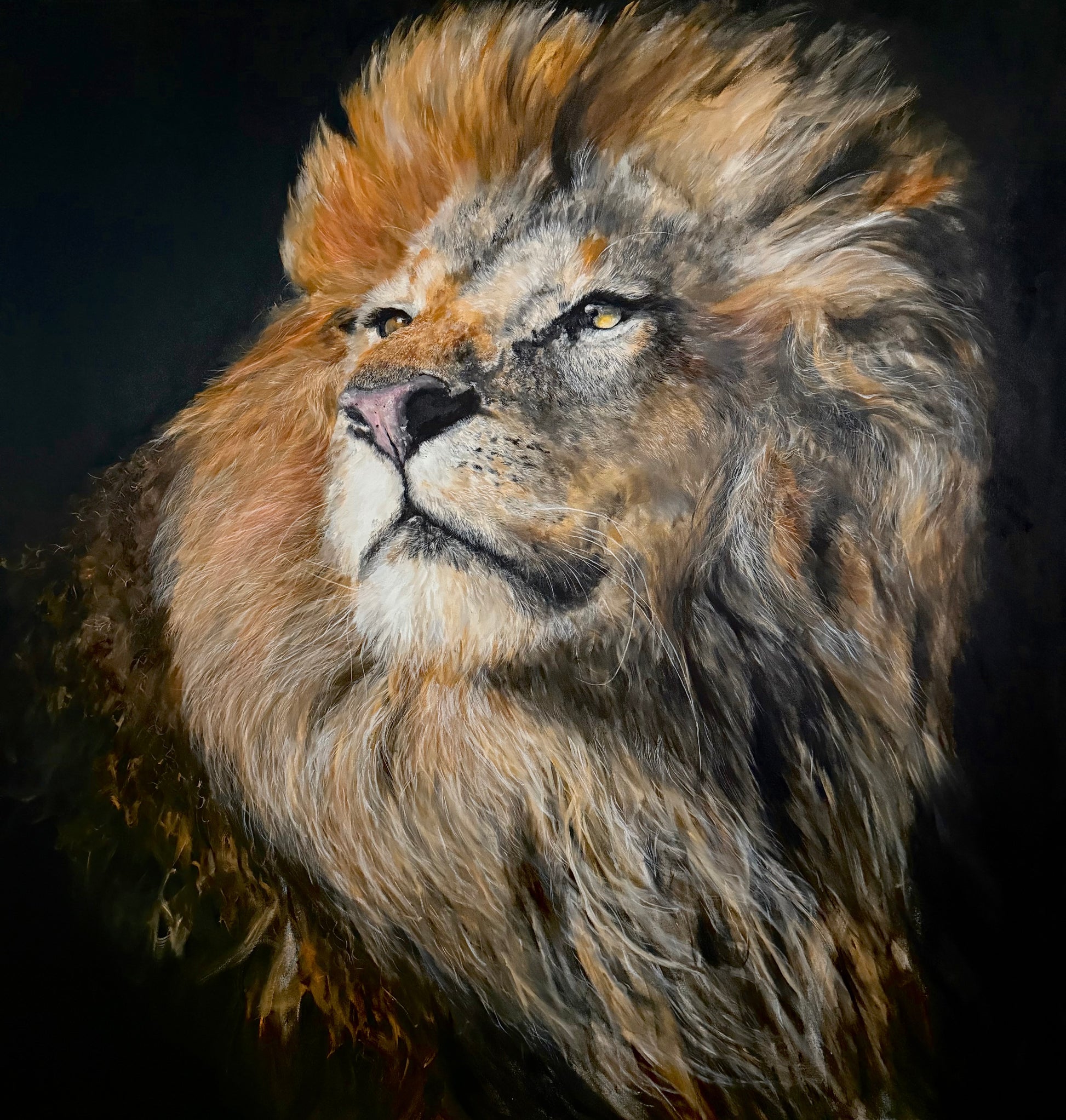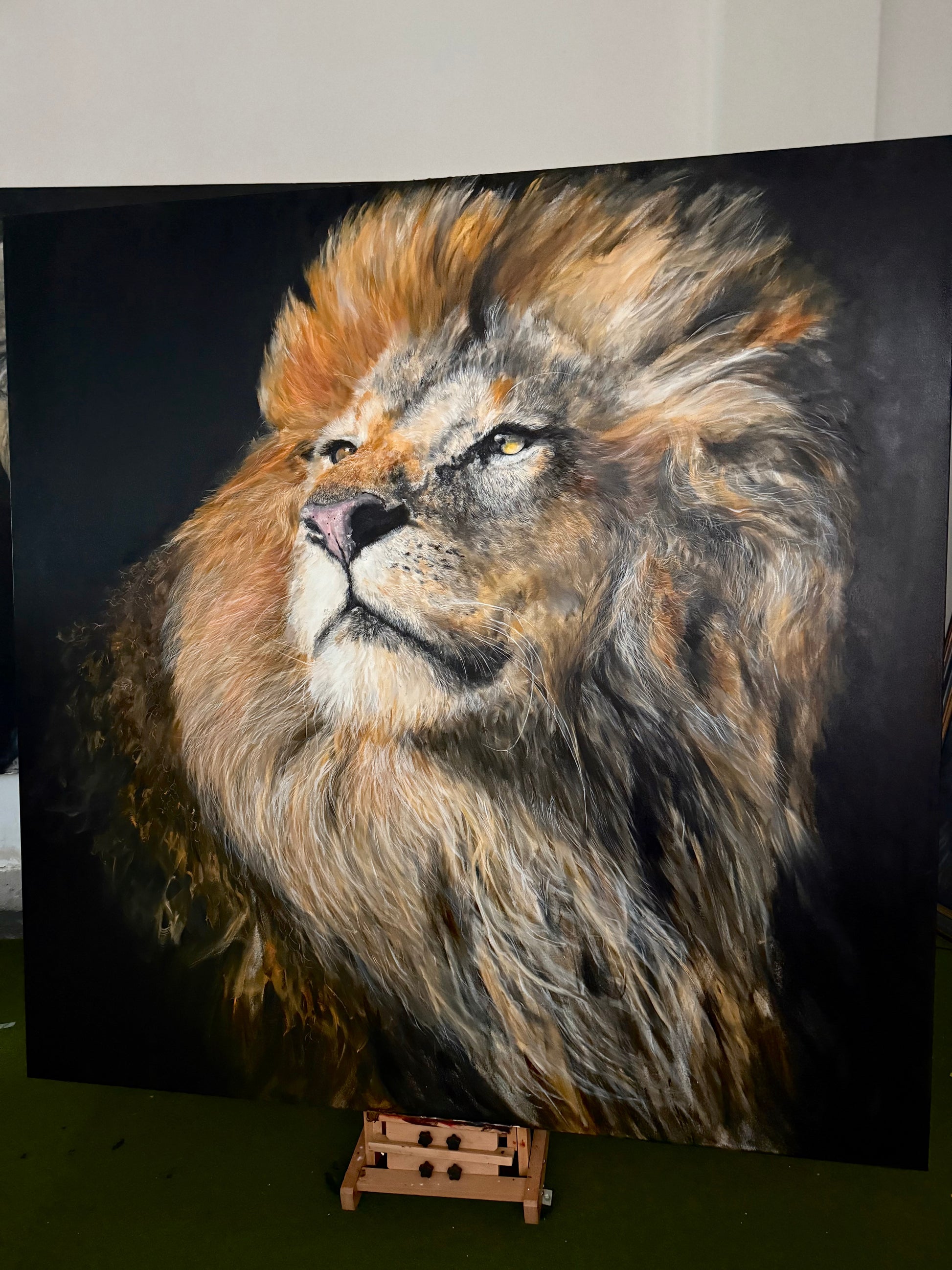 a powerful lionking like samba look around his land, the king's land; this hyper realistic oil painting size 200x200cm, means the up life attitude and bravery ,courage ,and determination